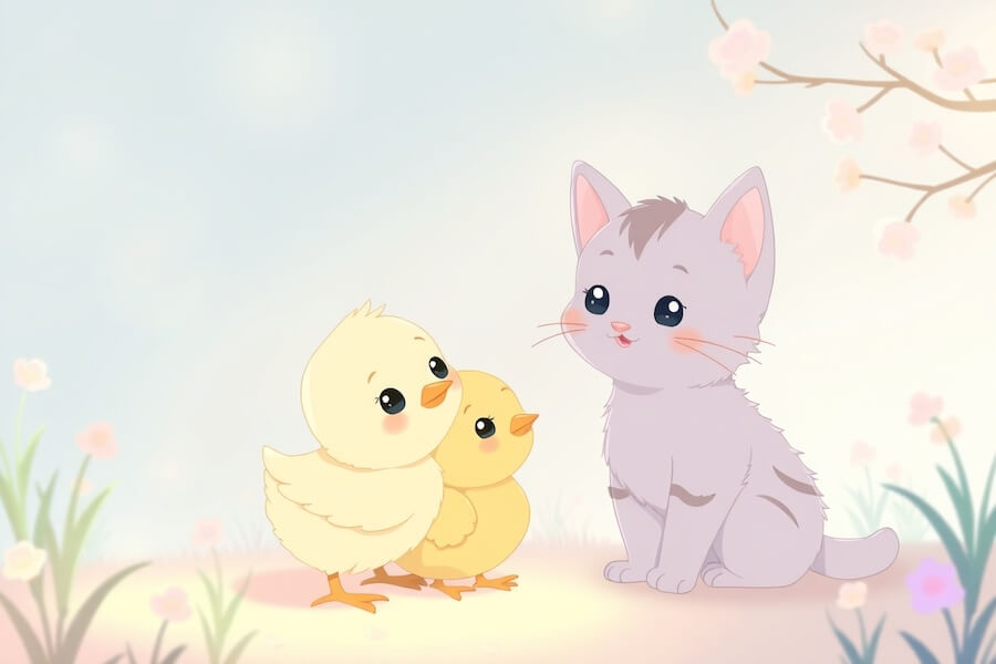 Mruczka delikatnie pogłaskała pisklę pazurkiem, starając się je uspokoić. Po chwili maluch przestał piszczeć i spojrzał na koty z zaciekawieniem.