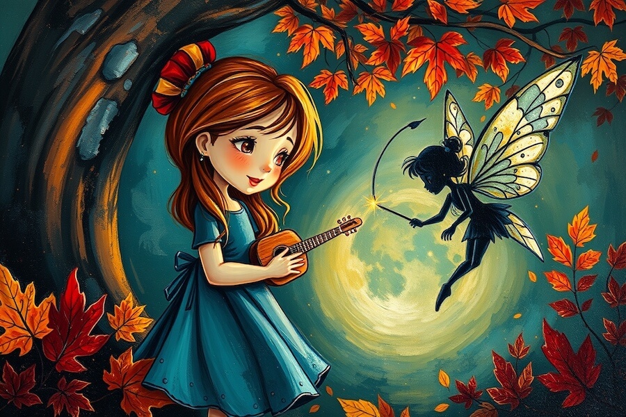 Nagle, w ciszy swojego pokoju, Maja usłyszała delikatny, melodyjny dźwięk. Otworzyła oczy i zobaczyła coś niezwykłego – małą, świecącą postać unoszącą się nad jej łóżkiem. Postać miała przezroczyste skrzydła i długie, srebrne włosy. W dłoniach trzymała maleńki, złoty instrument przypominający harfę.